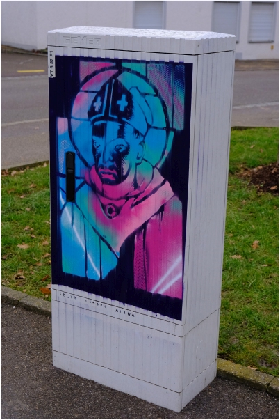 Dieses Streetart-Werk zum Brückenbauer Albertus-Magnus der Schülerinnen und Schülern des Albertus-Magnus-Gymnasiums Lauingen befindet sich in Lauingen, Brüderstraße (bei AOK).