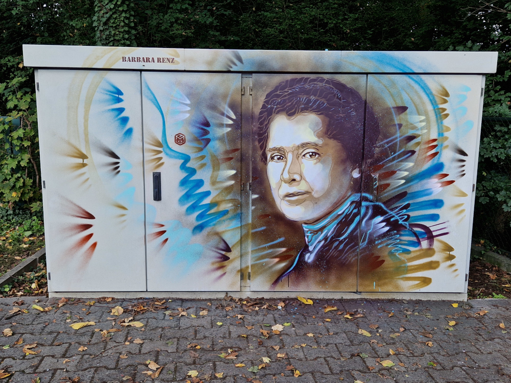 Bildnis von Dr. Barbara Renz von C215 in Streetart-Schablonentechnik am 1. Oktober 2025 in Dillingen, Regens-Wagner-Straße (Kreuzung zur Prälat-Hummel-Straße) gefertigt.
